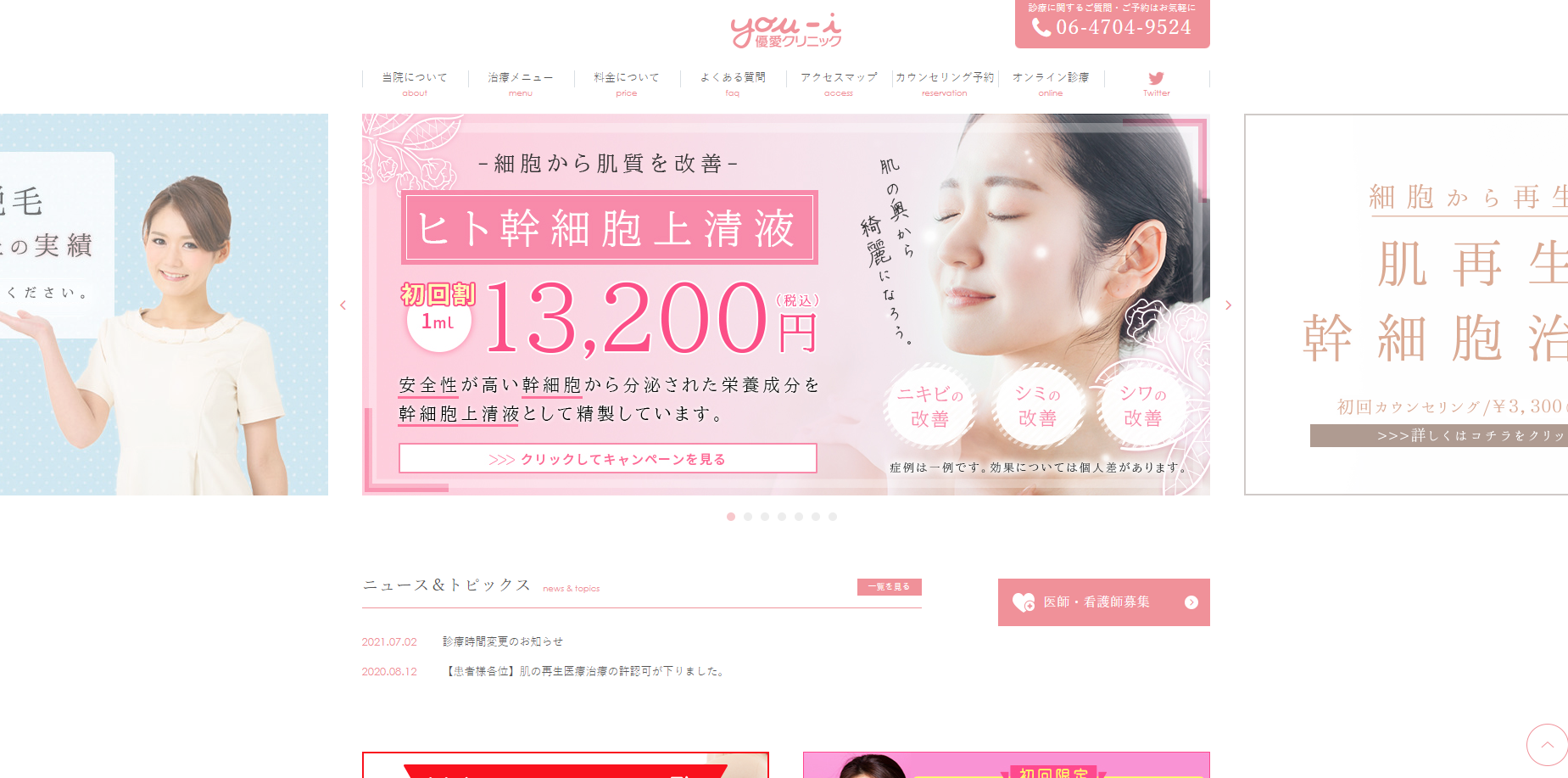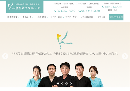 心斎橋と京橋に2院を展開する恵聖会クリニック(2022年6月現在)。「高度な美容医療の追求」「適正価格」「丁寧なアフターフォロー」を理念に、患者に寄り添った医療の提供を心掛けています。