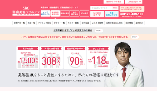 2022年6月現在で国内外に114拠点(118院)を展開している湘南美容クリニックグループ。二重整形や医療脱毛のテレビCMなどでもおなじみのクリニックです。